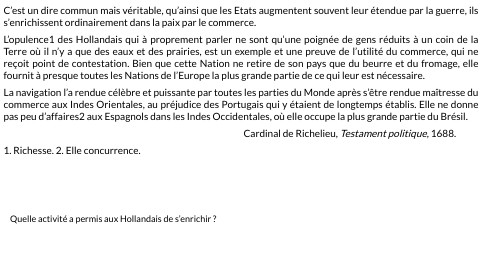 C’est un dire commun mais véritable, qu’ainsi que les Etats augmentent souvent leur étendue par la guerre, ils s’enrichissent ordinairement dans la paix par le commerce. L’opulence1 des Hollandais qui à proprement parler ne sont qu’une poignée de gens réduits à un coin de la Terre où il n’y a que des eaux et des prairies, est un exemple et une preuve de l’utilité du commerce, qui ne reçoit point de contestation. Bien que cette Nation ne retire de son pays que du beurre et du fromage, elle fournit à presque toutes les Nations de l’Europe la plus grande partie de ce qui leur est nécessaire. La navigation l’a rendue célèbre et puissante par toutes les parties du Monde après s’être rendue maîtresse du commerce aux Indes Orientales, au préjudice des Portugais qui y étaient de longtemps établis. Elle ne donne pas peu d’affaires2 aux Espagnols dans les Indes Occidentales, où elle occupe la plus grande partie du Brésil. Cardinal de Richelieu, Testament politique, 1688. 1. Richesse. 2. Elle concurrence.