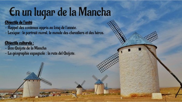 Objectifs de l'unité- Rappel des contenus appris au long de l'année.- Lexique : le portrait moral, le monde des chevaliers et des héros. Objectifs culturels :- Don Quijote de la Mancha- La géographie espagnole : la ruta del Quijote.