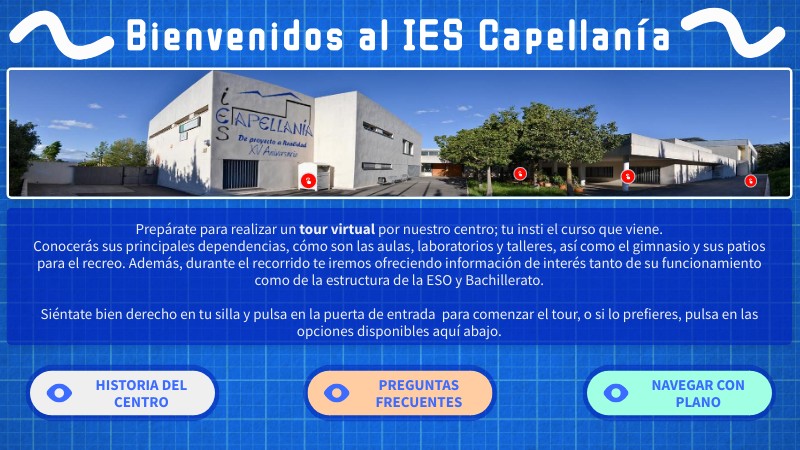 Prepárate para realizar un tour virtual por nuestro centro; tu insti el curso que viene. Conocerás sus principales dependencias, cómo son las aulas, laboratorios y talleres, así como el gimnasio y sus patios para el recreo. Además, durante el recorrido te iremos ofreciendo información de interés tanto de su funcionamiento como de la estructura de la ESO y Bachillerato. Siéntate bien derecho en tu silla y pulsa en la puerta de entrada para comenzar el tour, o si lo prefieres, pulsa en las opciones disponibles aquí abajo.