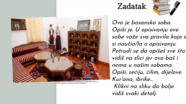 Ovo je bosanska soba. Opiši je. U opisivanju ove sobe važe sva pravila koja s si naučio/la o opisivanju. Potrudi se da opišeš sve što vidiš na slici jer ovo baš i nema u našim sobama. Opiši: sećiju, ćilim, dijelove Kur'ana, ibrike... Klikni na sliku da bolje vidiš svaki detalj.