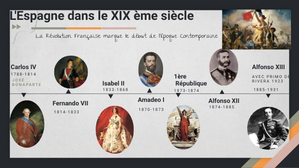 Isabel II est partie en 1868. Puis, il y a un gouvernement provisoire. Le gouvernement choisi un roi: Amadeo I Son règne est très difficile parce qu’il y a beaucoup de révoltes et une troisième guerre carliste. Finalement, il quitte l’Espagne en 1873. Les espagnoles votent pour une république