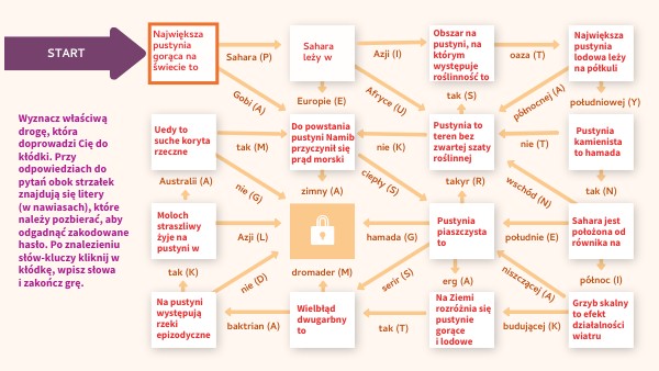 Wyznacz właściwą drogę, która doprowadzi Cię do kłódki. Przy odpowiedziach do pytań obok strzałek znajdują się litery (w nawiasach), które należy pozbierać, aby odgadnąć zakodowane hasło. Po znalezieniu słów-kluczy kliknij w kłódkę, wpisz słowa i zakończ grę.