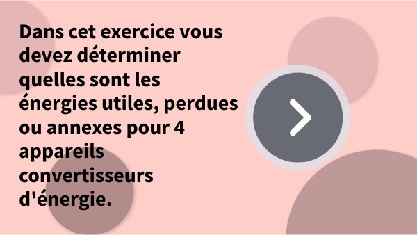 Dans cet exercice vous devez déterminer quelles sont les énergies utiles, perdues ou annexes pour 4 appareils convertisseurs d'énergie.