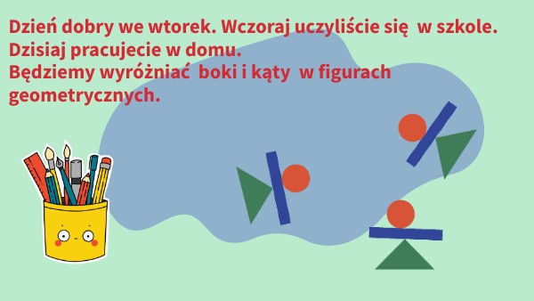 Dzień dobry we wtorek. Wczoraj uczyliście się w szkole. Dzisiaj pracujecie w domu. Będziemy wyróżniać boki i kąty w figurach geometrycznych.