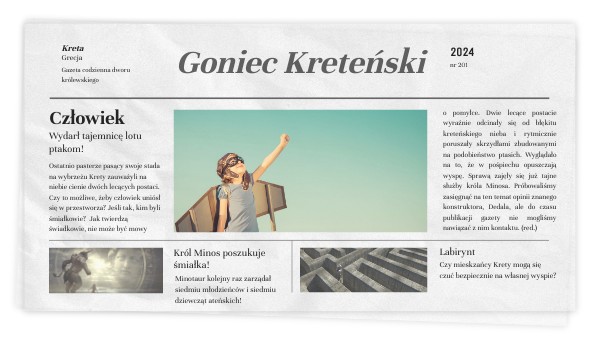 o pomyłce. Dwie lecące postacie wyraźnie odcinały się od błękitu kreteńskiego nieba i rytmicznie poruszały skrzydłami zbudowanymi na podobieństwo ptasich. Wyglądało na to, że w pośpiechu opuszczają wyspę. Sprawą zajęły się już tajne służby króla Minosa. Próbowaliśmy zasięgnąć na ten temat opinii znanego konstruktora, Dedala, ale do czasu publikacji gazety nie mogliśmy nawiązać z nim kontaktu. (red.)