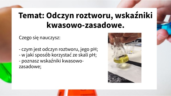 Czego się nauczysz: - czym jest odczyn roztworu, jego pH; - w jaki sposób korzystać ze skali pH; - poznasz wskaźniki kwasowo-zasadowe;