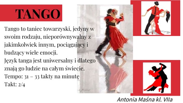 Tango to taniec towarzyski, jedyny w swoim rodzaju, nieporównywalny z jakimkolwiek innym, pociągający i budzący wiele emocji. Język tanga jest uniwersalny i dlatego znają go ludzie na całym świecie. Tempo: 31 – 33 takty na minutę Takt: 2/4