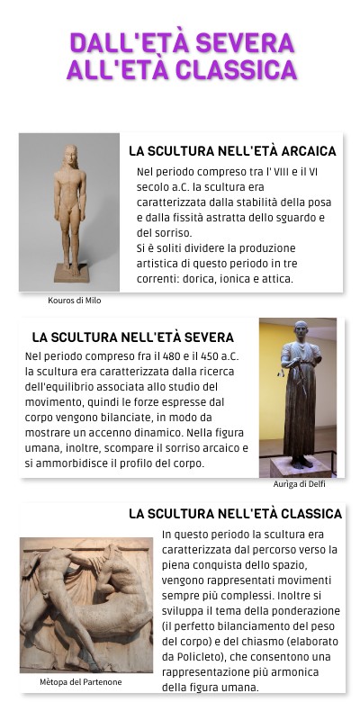 Nel periodo compreso tra l' VIII e il VI secolo a.C. la scultura era caratterizzata dalla stabilità della posa e dalla fissità astratta dello sguardo e del sorriso. Si è soliti dividere la produzione artistica di questo periodo in tre correnti: dorica, ionica e attica.
