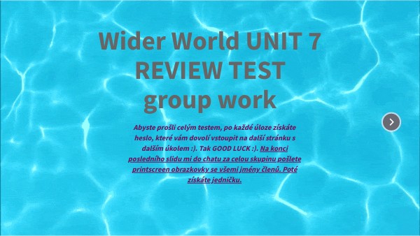 Abyste prošli celým testem, po každé úloze získáte heslo, které vám dovolí vstoupit na další stránku s dalším úkolem :). Tak GOOD LUCK :). Na konci posledního slidu mi do chatu za celou skupinu pošlete printscreen obrazkovky se všemi jmény členů. Poté získáte jedničku.