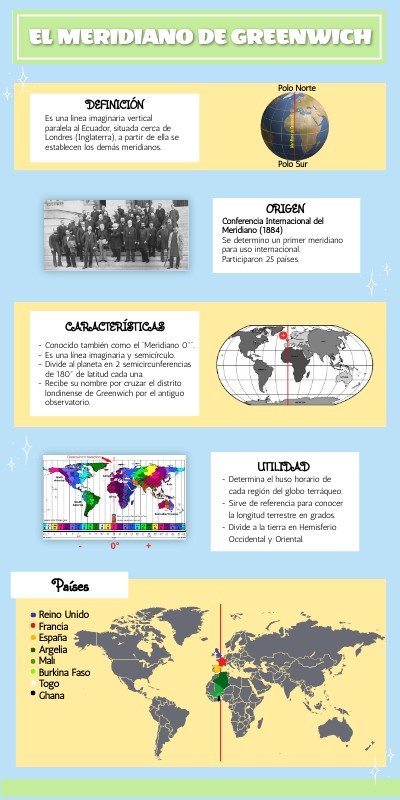 - Determina el huso horario de cada región del globo terráqueo. - Sirve de referencia para conocer la longitud terrestre en grados. - Divide a la tierra en Hemisferio Occidental y Oriental.