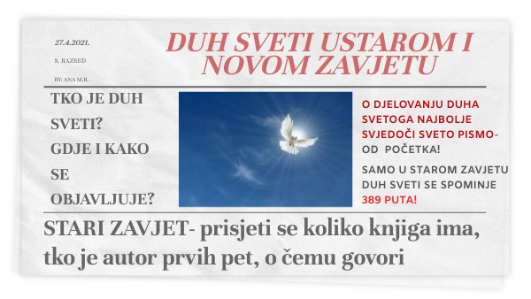 zadaci za rad: -kada ste dobro pogledali i pročitali prezentaciju (i više puta ako je potrebno), -pročitali zadane stranice iz vjeronaučnog udžbenika (143., 148) -prepisali označeno u vjeronaučne bilježnice -pogledali video isječke iz ppt slijedi zadaća: -ponovi kroz igru: https://wordwall.net/hr/resource/2113018 - nauči i ponovi: nazive i simbole za Duha Svetoga (pitati ću)