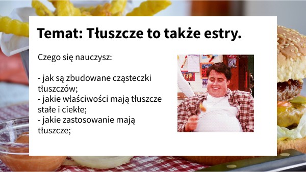 Czego się nauczysz: - jak są zbudowane cząsteczki tłuszczów; - jakie właściwości mają tłuszcze stałe i ciekłe; - jakie zastosowanie mają tłuszcze;