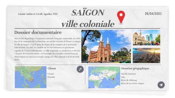 Ces deux documents sont des photos prises pour des cartes postales dont les photographes sont inconnus. Le document 1 nous montre la théâtre municipal de Saïgon pris en 1905 tandis que le doucement 4 nous montre la cathédrale de Saïgon mais dont la date est inconnue. Ces deux documents s’inspirent de l’architecture française et notamment des bâtiments célèbres de la capitale. En effet, le théâtre s’inspire du Petit Palais à Paris alors que la cathédrale s’inspire de la célèbre Notre-Dame de Paris. Le théâtre est le troisième européen a être construit à Saïgon et accueille majoritairement des troupes françaises depuis sa construction en 1899. La construction de la cathédrale est décidé en 1879 et elle est inaugurée en 1880 (voir le discours d’inauguration, document 5). Elle est financée par le budget de la colonie. Ces deux photos nous permettent de voir que Saïgon est construite de manière coloniale et son architecture se base sur celle de la ville de Paris. Saïgon est donc une ville française dans les colonies. La France tente d’amener ses coutumes et habitudes dans les colonnes avec les théâtres et la religion qui est occupe une place importante dans les colonies. Ces documents nous permettent de voir que l’architecture de Saïgon ressemble à celle de Paris avec des bâtiments qui s’inspirent de célèbres lieux parisiens mais dans les colonies.