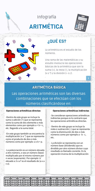 La aritmética es el estudio de los números.Una rama de las matemáticas y su estudio involucra las operaciones básicas de la aritmética que son la suma (+), la resta (-), la multiplicación (x o *) y la división (÷ o /). .
