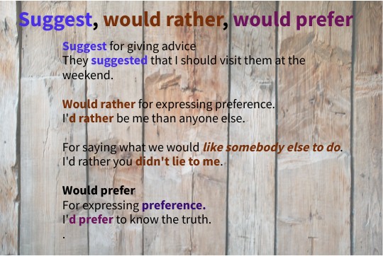 Suggest for giving advice They suggested that I should visit them at the weekend. Would rather for expressing preference. I'd rather be me than anyone else. For saying what we would like somebody else to do. I'd rather you didn't lie to me. Would prefer For expressing preference. I'd prefer to know the truth. .