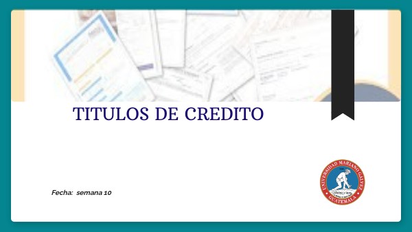 Rerefencias Ascarelli, T. (1947). Teoría General de los Títulos de Crédito. México: JUS. Ahumada, R. C. (1969). Títulos y Operaciones de Crédito (Sexta Edición ed.). México: Herrero, S.A. Lara, R. A. (2012). Derecho Mercantil Guatemalteco. Tomo II. Guatemala: Editorial Universitaria. Martínez, E. V. (2009). Instituciones de Derecho Mercantil (Segunda ed.). Guatemala: IUS. Molina, R. L. (1977). Títulos de crédito cambiarios. México: Porrúa. Código de Comercio de Guatemala, decreto 2-70 del Congreso de la República