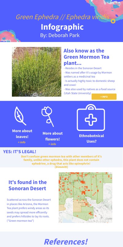 Scattered across the Sonoran Desert in places like Arizona, the Mormon Tea plant prefers windy areas so its seeds may spread more efficently and prefers hillsides to lay its roots. ("Green mormon tea")
