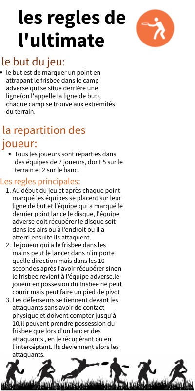 - le but est de marquer un point en attrapant le frisbee dans le camp adverse qui se situe derrière une ligne(on l'appelle la ligne de but), chaque camp se trouve aux extrémités du terrain.