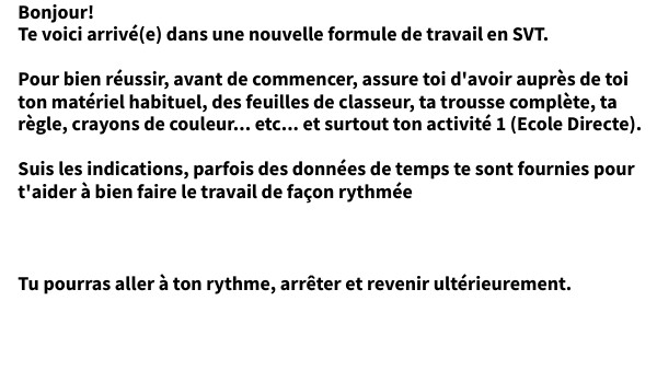 Bonjour! Te voici arrivé(e) dans une nouvelle formule de travail en SVT. Pour bien réussir, avant de commencer, assure toi d'avoir auprès de toi ton matériel habituel, des feuilles de classeur, ta trousse complète, ta règle, crayons de couleur... etc... et surtout ton activité 1 (Ecole Directe). Suis les indications, parfois des données de temps te sont fournies pour t'aider à bien faire le travail de façon rythmée