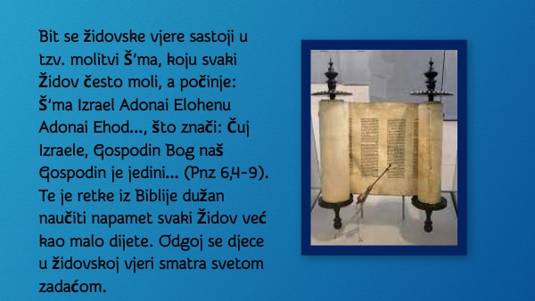 Bit se židovske vjere sastoji u tzv. molitvi Š’ma, koju svaki Židov često moli, a počinje: Š’ma Izrael Adonai Elohenu Adonai Ehod…, što znači: Čuj Izraele, Gospodin Bog naš Gospodin je jedini… (Pnz 6,4-9). Te je retke iz Biblije dužan naučiti napamet svaki Židov već kao malo dijete. Odgoj se djece u židovskoj vjeri smatra svetom zadaćom.