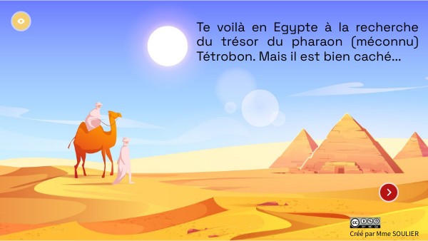 Te voilà en Egypte à la recherche du trésor du pharaon (méconnu) Tétrobon. Mais il est bien caché... Pour y accéder tu vas devoir résoudre des énigmes, récolter des indices... Bon courage !