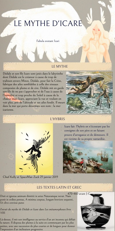 Icare fait l'hybris en n'écoutant pas les consignes de son père et en faisant preuve d'arrogance et de démesure. Il est victime de sa propre vantardise.