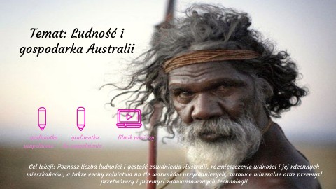 Cel lekcji: Poznasz liczba ludności i gęstość zaludnienia Australii, rozmieszczenie ludności i jej rdzennych mieszkańców, a także cechy rolnictwa na tle warunków przyrodniczych, surowce mineralne oraz przemysł przetwórczy i przemysł zaawansowanych technologii