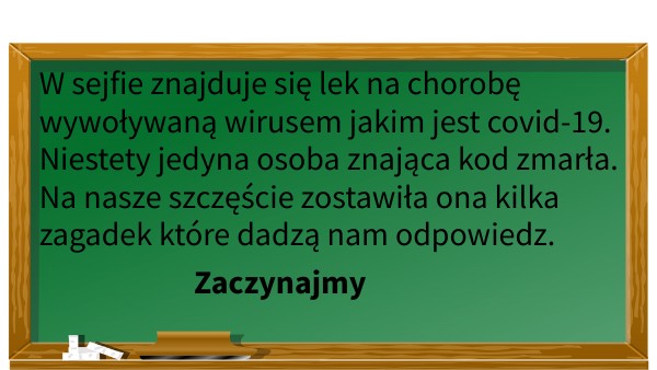 W sejfie znajduje się lek na chorobę wywoływaną wirusem jakim jest covid-19. Niestety jedyna osoba znająca kod zmarła. Na nasze szczęście zostawiła ona kilka zagadek które dadzą nam odpowiedz.