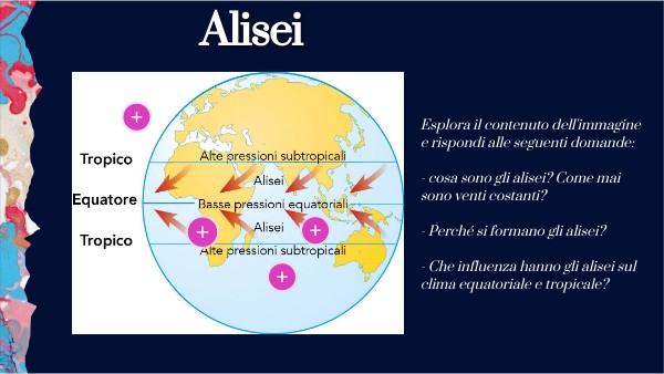 Esplora il contenuto dell'immagine e rispondi alle seguenti domande: - cosa sono gli alisei? Come mai sono venti costanti? - Perché si formano gli alisei? - Che influenza hanno gli alisei sul clima equatoriale e tropicale?