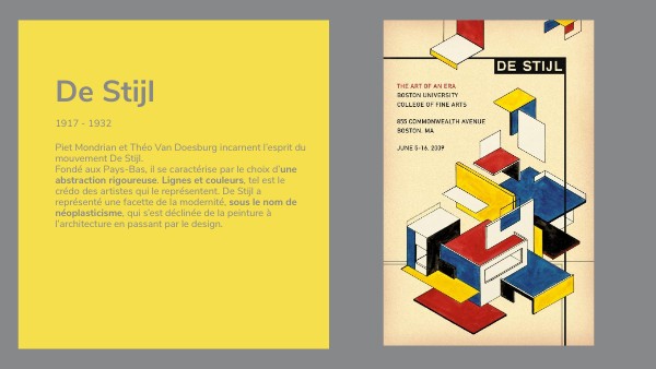 le groupe Art Concret à Paris. Malheureusement, il décède un an plus tard. Mondrian lui survit d’une quinzaine d’années, réfugié aux États-Unis pendant la Seconde Guerre mondiale. De Stijl a eu une grande influence sur l’art du Bauhaus et continue d’inspirer aujourd’hui le design contemporain.