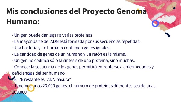 - Un gen puede dar lugar a varias proteínas.- La mayor parte del ADN está formada por sus secuencias repetidas. -Una bacteria y un humano contienen genes iguales. - La cantidad de genes de un humano y un ratón es la misma. - Un gen no codifica sólo la síntesis de una proteína, sino muchas. - Conocer la secuencia de los genes permitirá enfrentarse a enfermedades y deficiencias del ser humano. - El 76 restante es "ADN basura" - Tenemos unos 23.000 genes, el número de proteínas diferentes sea de unas 100.000
