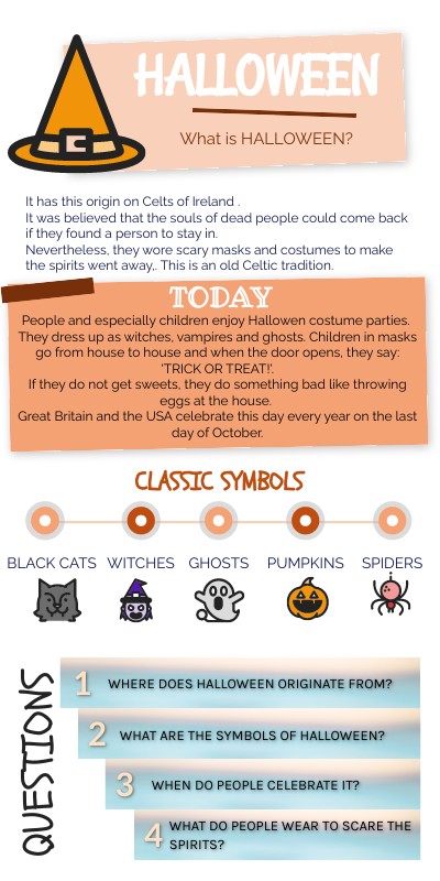 People and especially children enjoy Hallowen costume parties. They dress up as witches, vampires and ghosts. Children in masks go from house to house and when the door opens, they say: 'TRICK OR TREAT!'. If they do not get sweets, they do something bad like throwing eggs at the house. Great Britain and the USA celebrate this day every year on the last day of October.