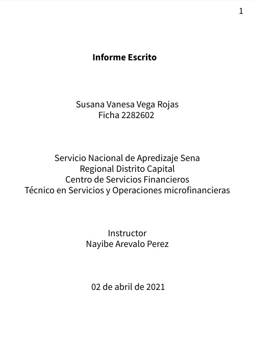 Susana Vanesa Vega Rojas Ficha 2282602 Servicio Nacional de Apredizaje Sena Regional Distrito Capital Centro de Servicios Financieros Técnico en Servicios y Operaciones microfinancieras Instructor Nayibe Arevalo Perez 02 de abril de 2021