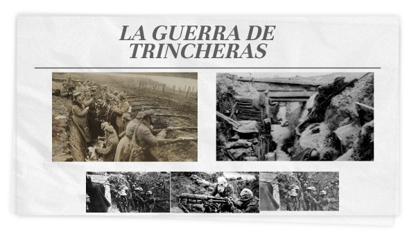 La guerra de trincheras es una táctica para hacer guerra que consistió en una zanja cavada en la tierra que tiene como objetivo proteger el avance enemigo. En una guerra de trincheras, la forma de combatir implica que los combatientes mantengan líneas inmóviles de zanjas cavadas en el terreno y enfrentadas entre sí.Trincheras cubiertas: estas se ubican detrás de la primera línea de trincheras, sirven de protección a los combatientes en caso de que ataquen la primera línea defensiva. Trincheras de apoyo: son las que poseen refugios subterráneos, en los que descansan los soldados que no estén luchando. Trincheras de reserva y de comunicación: está rama sirve para transportar todos los suministros que se necesiten tanto alimentos como tropas de reemplazo. Tierra de Nadie: está área es el terreno que se ubica en medio de los dos bandos, es la zona más peligrosa porque esta cubierta de alambres y puede pasarse a ser un blanco fácil.