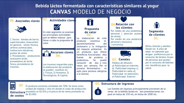 Las fuentes de ingresos principalmente provienen de la venta de la bebida láctea en dos presentaciones: six pack en bolsa de 250 mL, en bolsa de 1000 mL.