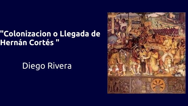 -"Colonizacion o Llegada de Hernán Cortés a Veracruz " - En el decenio de 1950 en un contexto de violencia contra los indios - 4,92m x 5,27m - Al fresco, técnica que utiliza mezclas químicas de pigmentos, agua, arena y cal. - Palacio Nacional de México - El muralismo