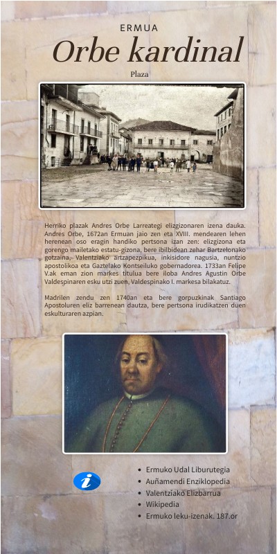 Herriko plazak Andres Orbe Larreategi elizgizonaren izena dauka. Andres Orbe, 1672an Ermuan jaio zen eta XVIII. mendearen lehen herenean oso eragin handiko pertsona izan zen: elizgizona eta gorengo mailetako estatu-gizona, bere ibilbidean zehar Bartzelonako gotzaina, Valentziako artzapezpikua, inkisidore nagusia, nuntzio apostolikoa eta Gaztelako Kontseiluko gobernadorea. 1733an Felipe V.ak eman zion markes titulua bere iloba Andres Agustin Orbe Valdespinaren esku utzi zuen, Valdespinako I. markesa bilakatuz. Madrilen zendu zen 1740an eta bere gorpuzkinak Santiago Apostoluren eliz barrenean dautza, bere pertsona irudikatzen duen eskulturaren azpian.