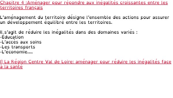 Chapitre 4 :Aménager pour répondre aux inégalités croissantes entre les territoires français L’aménagement du territoire désigne l’ensemble des actions pour assurer un développement équilibré entre les territoires. Il s’agit de réduire les inégalités dans des domaines variés : -Éducation -L’accès aux soins -Les transports -L’économie…. I] La Région Centre Val de Loire: aménager pour réduire les inégalités face à la santé