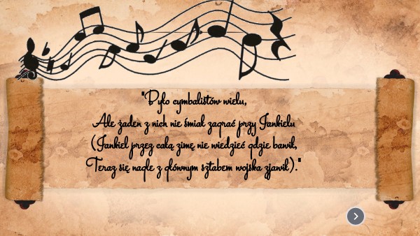 "Było cymbalistów wielu, Ale żaden z nich nie śmiał zagrać przy Jankielu (Jankiel przez całą zimę nie wiedzieć gdzie bawił, Teraz się nagle z głównym sztabem wojska zjawił)."