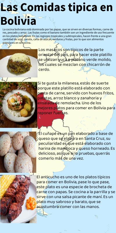 La cocina boliviana está dominada por las papas, que se sirven en diversas formas, carne de res, pescado y arroz. Las frutas como el banano también son un ingrediente de uso frecuente en los platos bolivianos. En las regiones tropicales y subtropicales, hacen frente a una gran cantidad de soja, canola, caña de azúcar, verduras y frutas, por lo que son alimentos populares en su cocina.