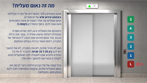 אתם נמצאים בלובי במשרדים של חברה מצליחה באמצע אירוע שיא של יוניסטרים. אתם שואלים את אחד העובדים איפה השירותים והוא עונה לכם: בסוף המסדרון בקומה 5. הזמנתם את המעלית ורגע לפני שהיא נסגרת ומתחילה לעלות מישהו שולח יד, עוצר את הדלת ונכנס. מיד אתם מזהים שזה המנכ"ל והמייסד של החברה, דמות מאוד בכירה בעולם העסקים. הוא לא מכיר אתכם, לא את החברה, לא את המוצר ויש לכם בין 30 ל 35 שניות להעביר לו את כל המידע ולהניע אותו לפעולה לפני שהמעלית תגיע לקומה 5 והוא ייצא להמשך היום שלו. בכל קומה של של הבניין תלמדו כיצד לבנות את נאום המעלית שלכם, ובקומה החמישית יחכה לכם מבחן סיום. בהצלחה!