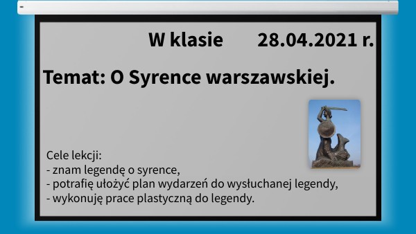 Cele lekcji: - znam legendę o syrence, - potrafię ułożyć plan wydarzeń do wysłuchanej legendy, - wykonuję prace plastyczną do legendy.
