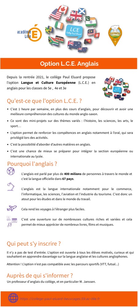 Depuis la rentrée 2021, le collège Paul Eluard propose l’option Langue et Culture Européenne (L.C.E.) en anglais pour les classes de 5e , 4e et 3e
