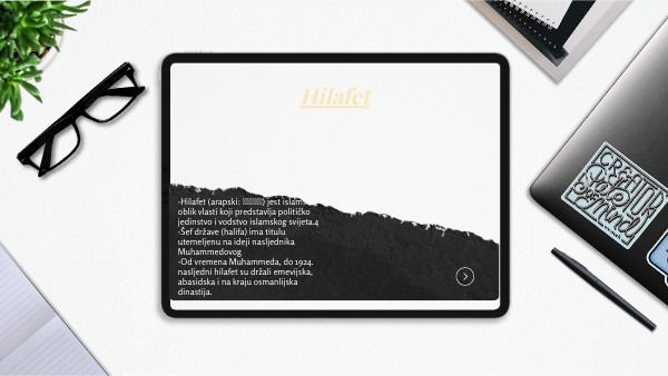-Hilafet (arapski: خلافة) jest islamski oblik vlasti koji predstavlja političko jedinstvo i vodstvo islamskog svijeta.4-Šef države (halifa) ima titulu utemeljenu na ideji nasljednika Muhammedovog -Od vremena Muhammeda, do 1924. nasljedni hilafet su držali emevijska, abasidska i na kraju osmanlijska dinastija.