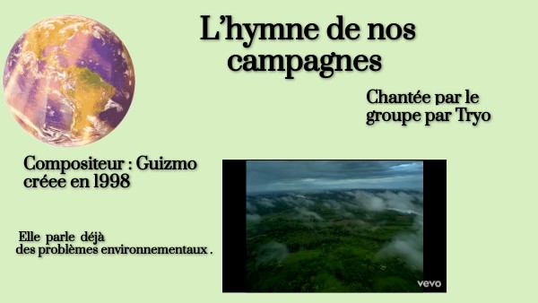 Refrain:} C'est l'hymne de nos campagnes De nos rivières, de nos montagnes De la vie man, du monde animal Crie-le bien fort, use tes cordes vocales!