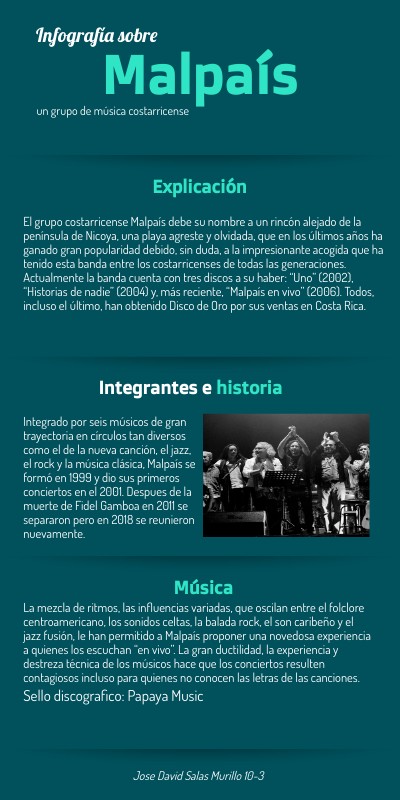 El grupo costarricense Malpaís debe su nombre a un rincón alejado de la península de Nicoya, una playa agreste y olvidada, que en los últimos años ha ganado gran popularidad debido, sin duda, a la impresionante acogida que ha tenido esta banda entre los costarricenses de todas las generaciones.Actualmente la banda cuenta con tres discos a su haber: “Uno” (2002), “Historias de nadie” (2004) y, más reciente, “Malpaís en vivo” (2006). Todos, incluso el último, han obtenido Disco de Oro por sus ventas en Costa Rica.