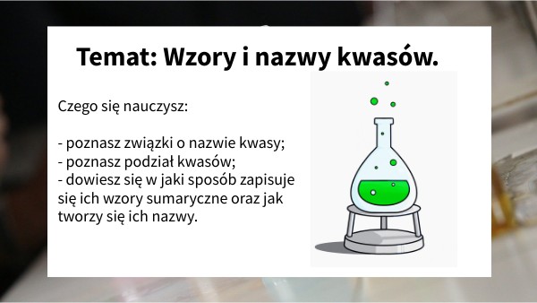 Czego się nauczysz: - poznasz związki o nazwie kwasy; - poznasz podział kwasów; - dowiesz się w jaki sposób zapisuje się ich wzory sumaryczne oraz jak tworzy się ich nazwy.