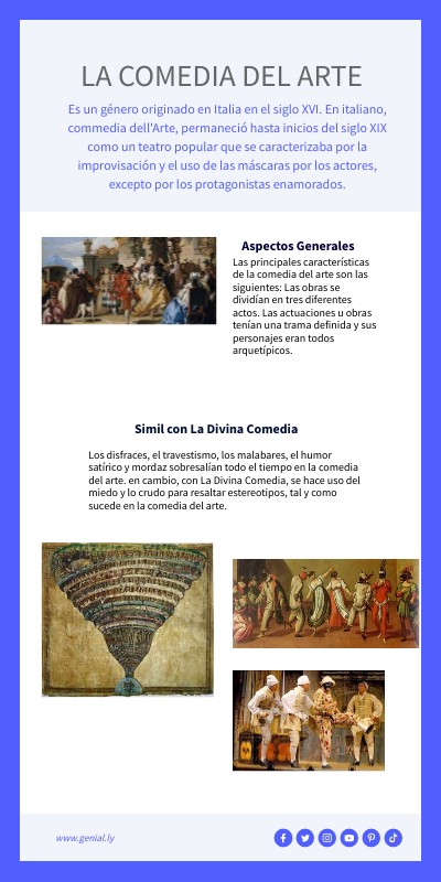 Es un género originado en Italia en el siglo XVI. En italiano, commedia dell'Arte, permaneció hasta inicios del siglo XIX como un teatro popular que se caracterizaba por la improvisación y el uso de las máscaras por los actores, excepto por los protagonistas enamorados.