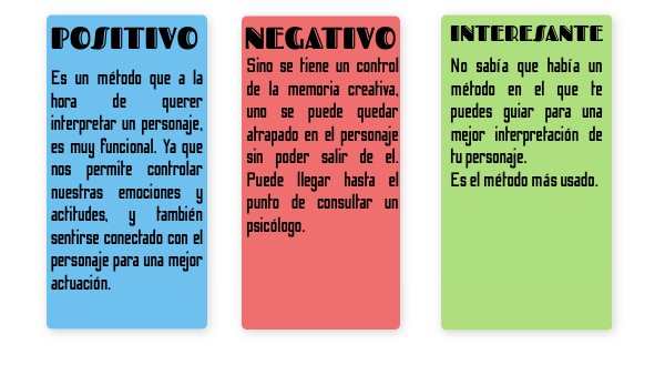 Es un método que a la hora de querer interpretar un personaje, es muy funcional. Ya que nos permite controlar nuestras emociones y actitudes, y también sentirse conectado con el personaje para una mejor actuación.