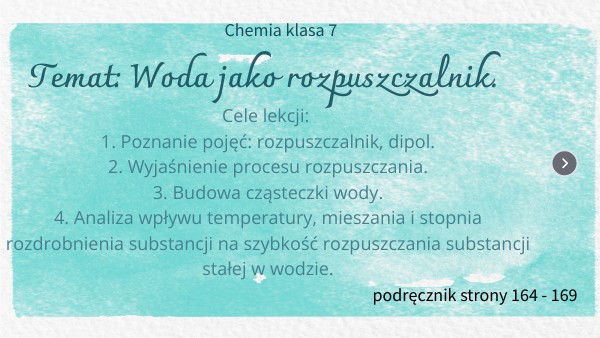 Cele lekcji: 1. Poznanie pojęć: rozpuszczalnik, dipol. 2. Wyjaśnienie procesu rozpuszczania. 3. Budowa cząsteczki wody. 4. Analiza wpływu temperatury, mieszania i stopnia rozdrobnienia substancji na szybkość rozpuszczania substancji stałej w wodzie.